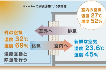 「デシカント換気システム」は、除湿した空気を各部屋に供給し、家中の湿度を50%前後に保ちます。そのため、室温が27~28℃でも暑さを感じにくく、空気がさらっとして快適です。