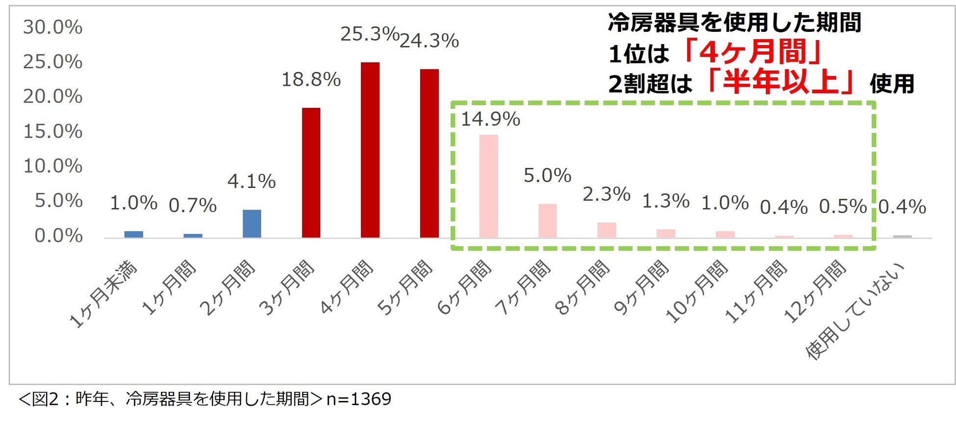 「昨年、冷房器具を合計で何ヶ月間使用しましたか?」と尋ねたところ、1位は「4ヶ月間」(25.3%)、2位は「5ヶ月間」(24.3%)、3位は「3ヶ月間」(18.8%)という結果になりました。