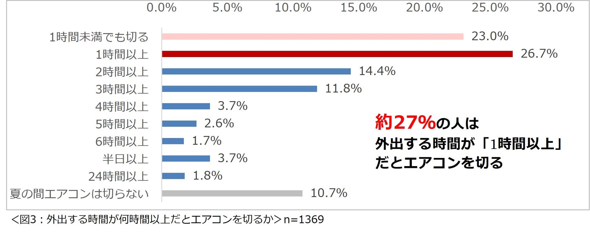 「外出する時間が何時間以上だとエアコンを切りますか?」と尋ねたところ、「1時間以上」という人が最も多く26.7%、次いで、「1時間未満」という人が23.0%という結果になりました。一方で、10.7%の人は「夏の間エアコンは切らない」と回答しています。(図3)