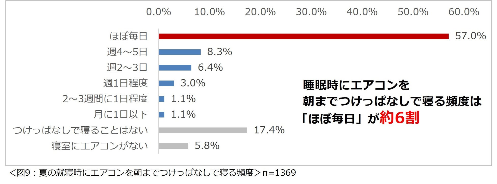 夏の就寝時にエアコンを朝までつけっぱなしで寝る頻度は、「ほぼ毎日」という人が約6割。