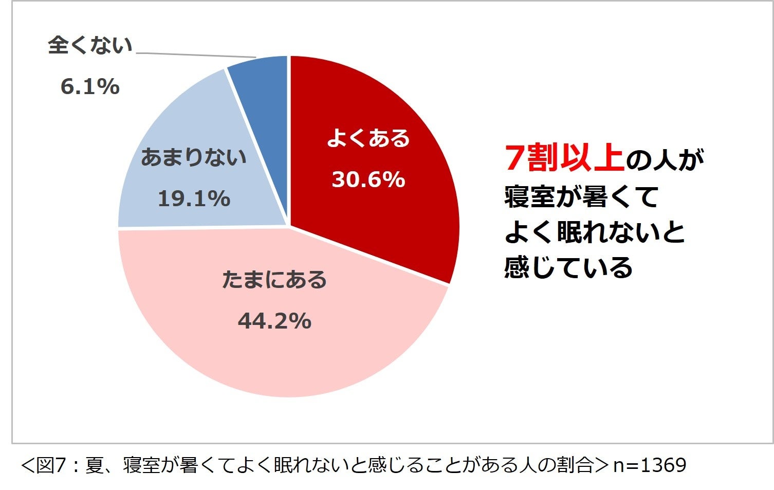 「夏に、寝室が暑くてよく眠れないと感じることはありますか?」と尋ねたところ、「よくある」(30.6%)、「たまにある」(44.2%)が合わせて74.8%となり、寝室の暑さが多くの人の睡眠の質に影響を及ぼしていることが分かりました。(図7)