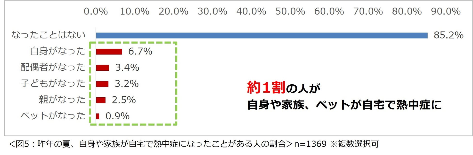「昨年の夏、自身や家族が自宅で熱中症になったことがありますか?」と尋ねたところ、「なったことはない」と答えた人が8割以上でしたが、約1割は自身や家族、ペットが自宅で熱中症になったと回答しました。(図5)