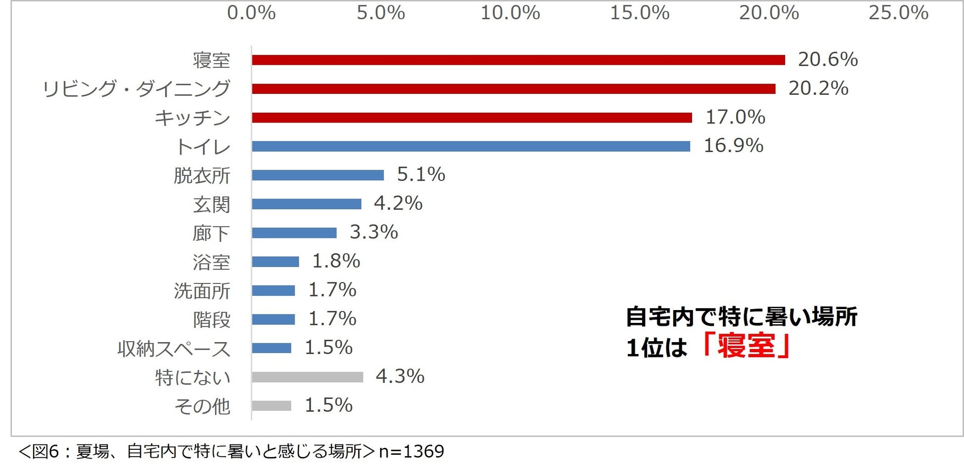 「夏場、自宅内で特に暑いと感じる場所はどこですか?」と尋ねたところ、1位は「寝室」(20.6%)、2位は「リビング・ダイニング」(20.2%)、3位は「キッチン」(17.0%)という結果になりました。(図6)