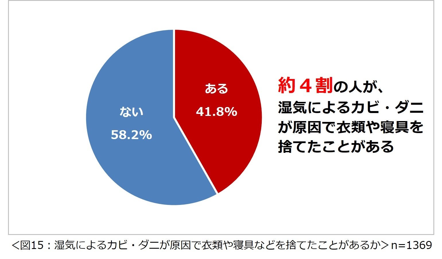 「湿気によるカビ・ダニが原因で衣類や寝具などを捨てたことがありますか?」と尋ねたところ、41.8%の人が湿気によるカビ・ダニが原因で衣類や寝具などを捨てた経験が「ある」と答えました。(図15)