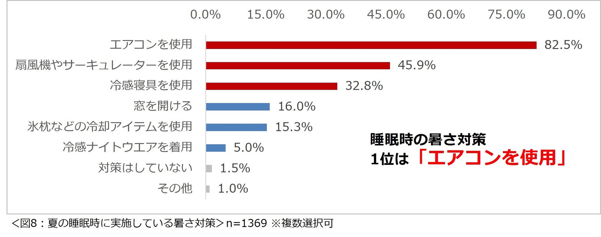 また、「睡眠時に実施している暑さ対策」について答えてもらったところ、1位は「エアコンを使用」(82.5%)、2位は「扇風機やサーキュレーターを使用」(45.9%)、3位は「冷感寝具を使用」(32.8%)という結果になりました。(図8)
