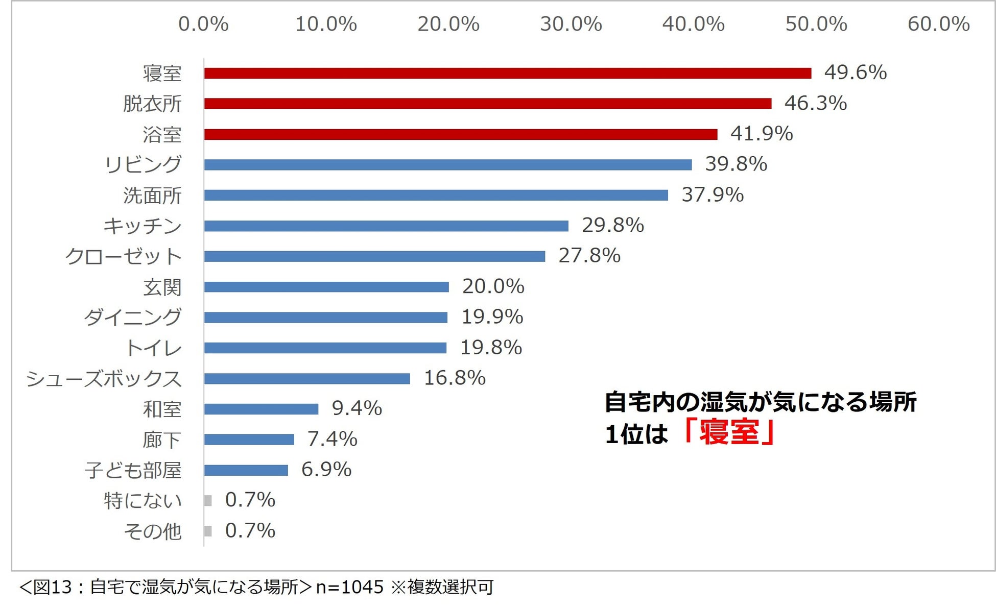 また、夏場に自宅内の湿気が気になると回答した1045名に、「湿気が気になる場所」について答えてもらったところ、1位は「寝室」(49.6%)、2位は「脱衣所」(46.3%)、3位は「浴室」(41.9%)という結果になりました。(図13)