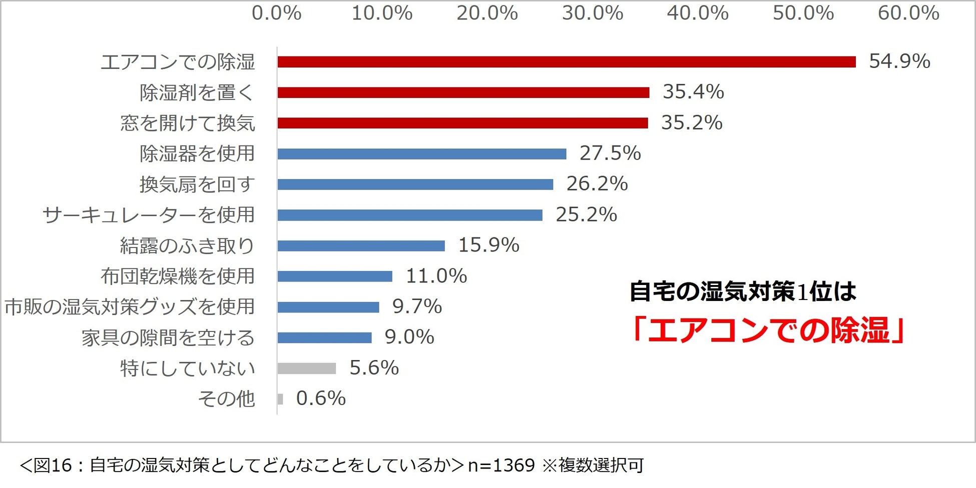 自宅の湿気対策について尋ねたところ、1位は「エアコンでの除湿」(54.9%)、2位は「除湿剤を置く」(35.4%)、3位は「窓を開けて換気」(35.2%)という結果になりました。(図16)