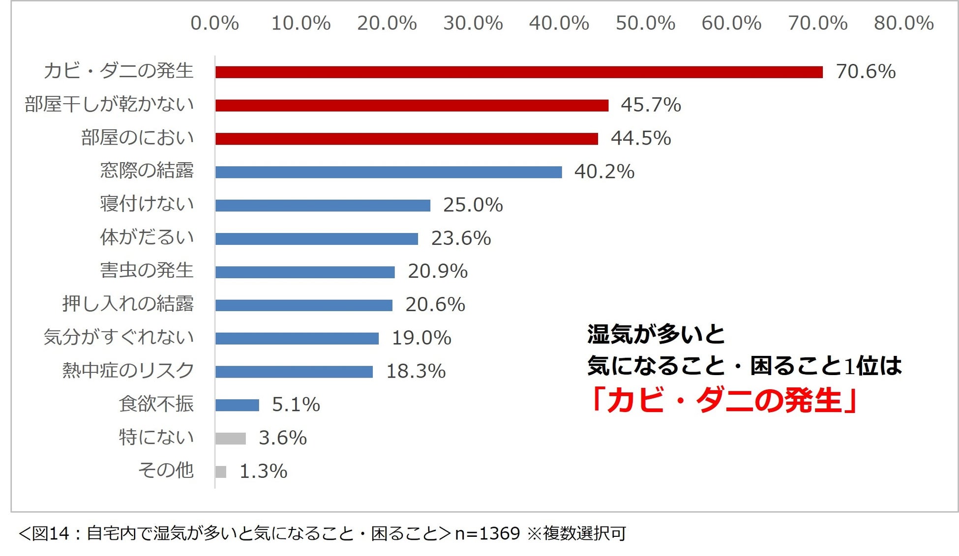 「自宅内で湿気が多いと気になること・困ることは何ですか?」と尋ねたところ、1位は「カビ・ダニの発生」(70.6%)、2位は「部屋干しが乾かない」(45.7%)、3位は「部屋のにおい」(44.5%)という結果になりました。(図14)