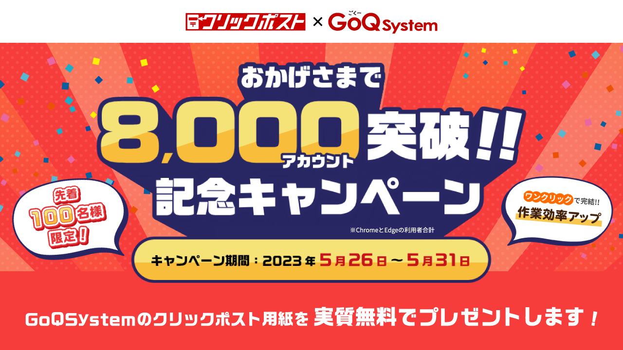 【クリックポスト用紙を実質無料でプレゼント】クリックポスト拡張機能の利用者8,000アカウント突破を記念して、期間限定キャンペーンを実施