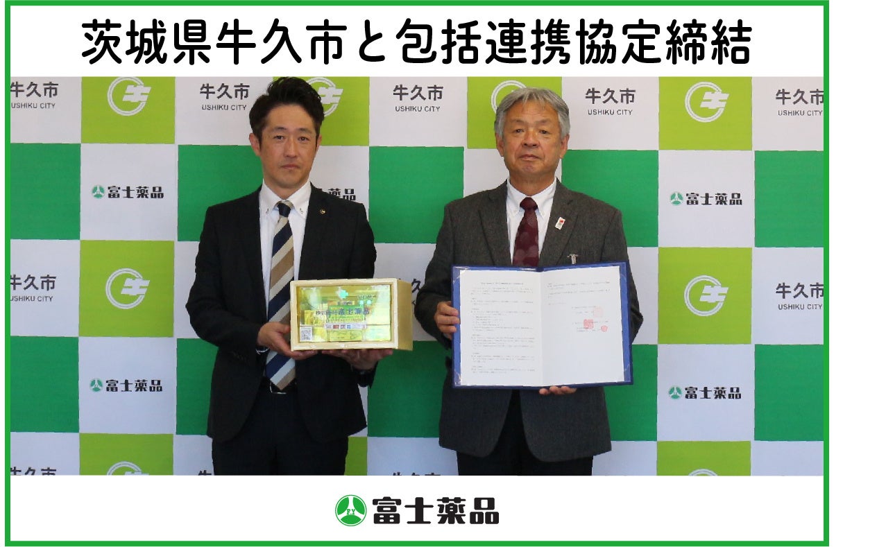 この度、富士薬品は、牛久市の地域住民の「健康づくり」の取り組みにおいて、セルフメディケーションならびに防災の側面から支援できると考え、包括連携協定の締結に至りました。