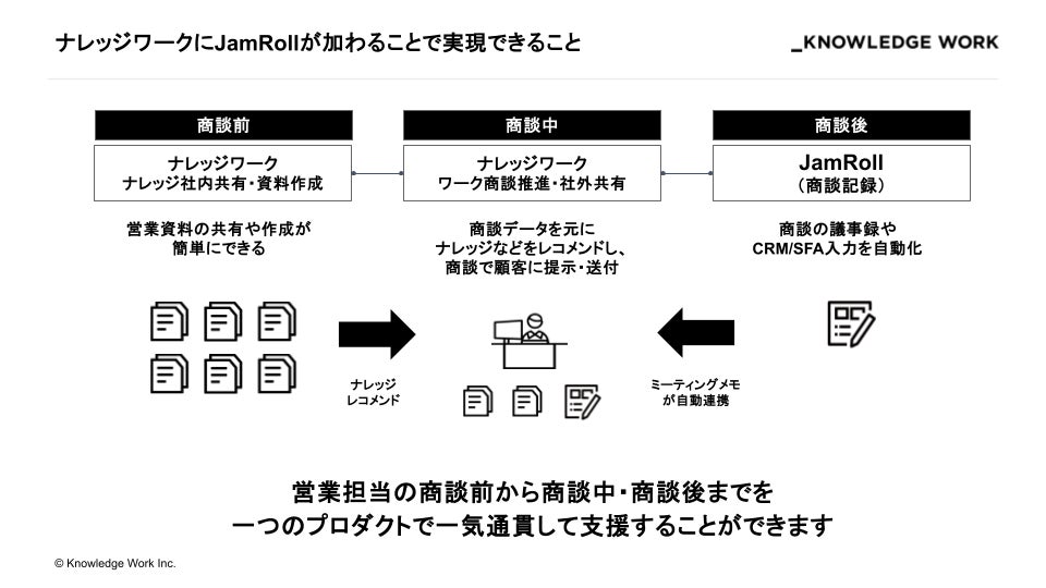 今回「ナレッジワーク」と「JamRoll」を連携・統合することにより、営業担当の商談に関わるあらゆるプロセスを支援することが可能になります。