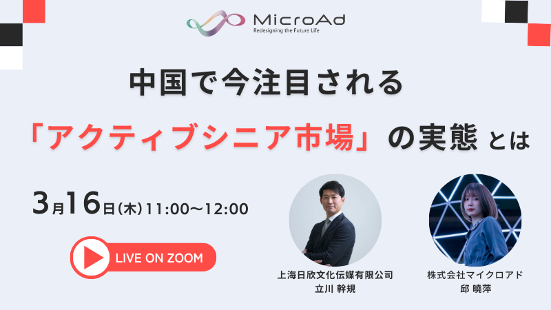 株式会社マイクロアド(本社:東京都渋谷区、代表取締役 執行役員社長:渡辺健太郎、以下 マイクロアド)と上海日欣文化伝媒有限公司(本社:上海 総経理:吕辰晔、以下「上海日欣文化」)は共同で、訪日中国人観光客におけるインバウンドマーケティング担当者向けに、中国で今注目される「アクティブシニア市場」の実態と、中国現地の最新情報を解説するウェビナーを開催いたします。