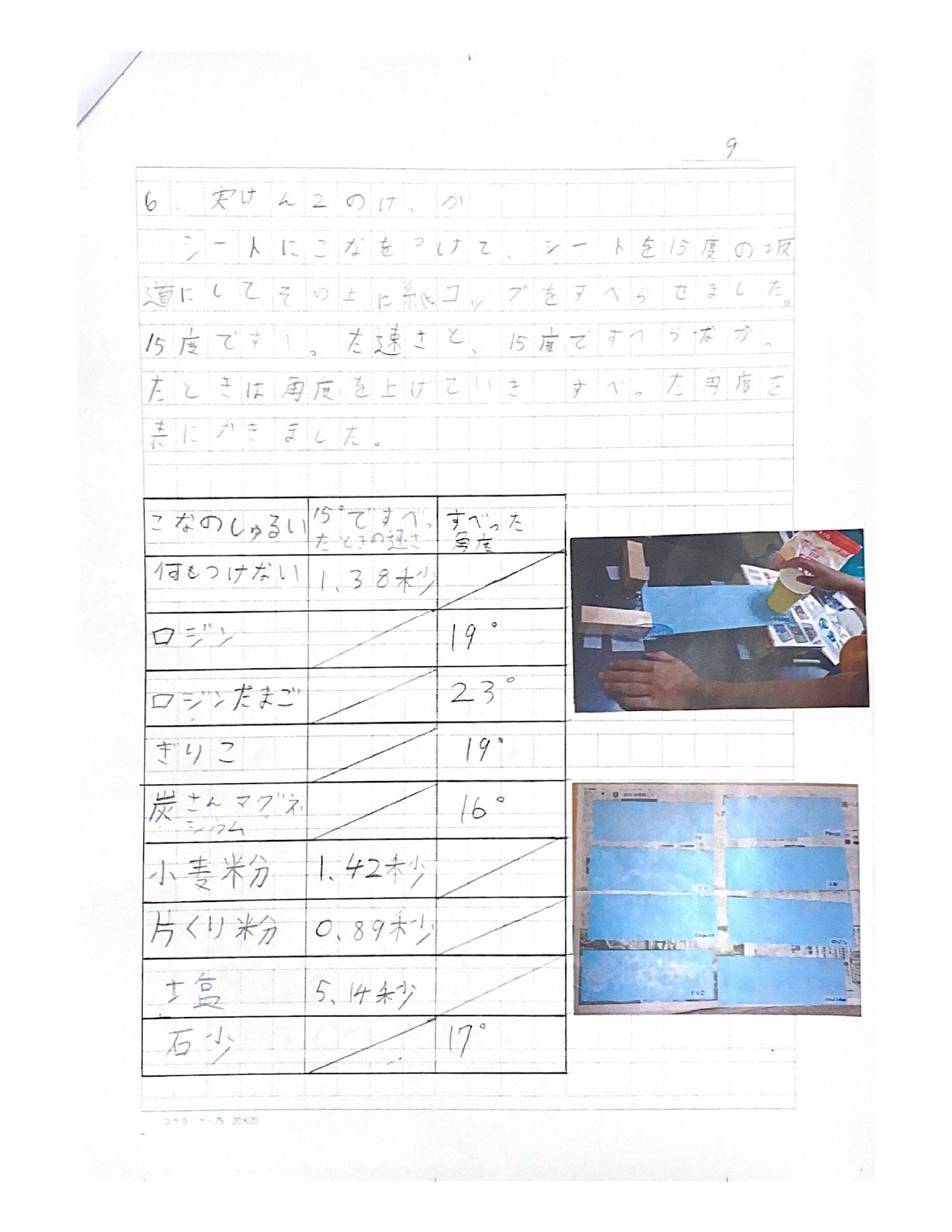 手に粉をつけてバットを振る、粉をまぶしたシートを使って坂を作り、その上に紙コップを滑らせ、紙コップが滑った角度などを比較するなどといった3種類の実験を通して、一番すべりにくい粉は何かを調べている。