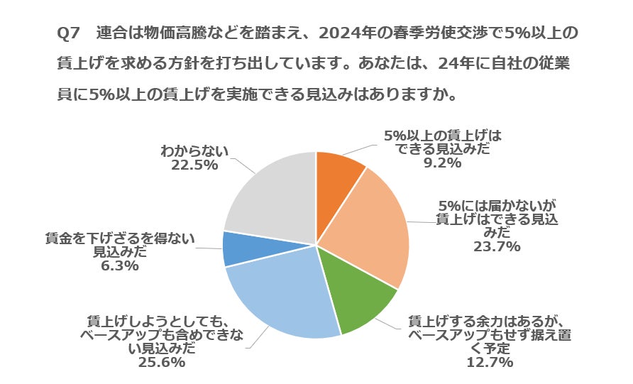 自社の従業員に「5%以上の賃上げをできる見込みだ」は9.2%にとどまり、「5%には届かないが賃上げはできる見込みだ」23.7%を合わせても全体の3分の1程度だった。「賃上げ余力はあるがベースアップもせず据え置く予定」12.7%、「賃上げしようとしてもベースアップも含めてできない見込みだ」が25.6%、「賃金を下げざるを得ない見込み」も6.3%あった。