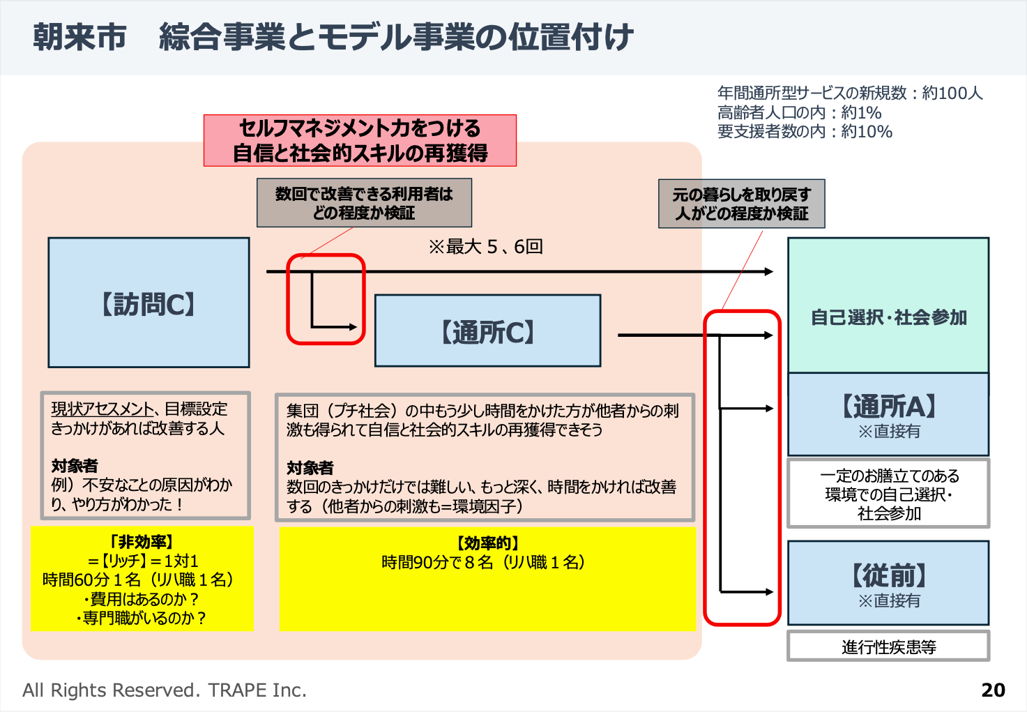 その影響により、通所型短期集中サービス(リエイブルメント)の利用が低迷し、事業の見直しの必要性が高まっている