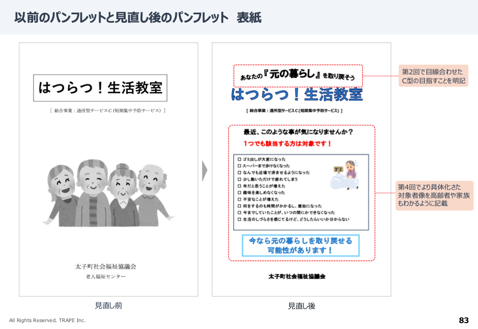 これまでは利用者から「デイケアが良い」と言われた際に十分な説明ができない場面もあったが事業の目的が整理され、分かりやすいパンフレットが作成されたことで、対象者に対して丁寧で前向きな説明ができるようになり、自信を持って説明できると思った。