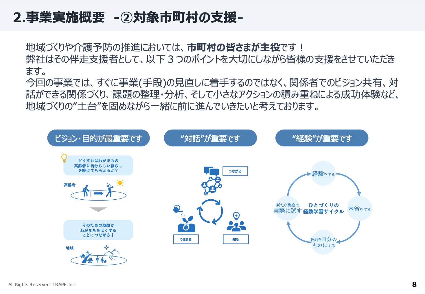 地域づくりや介護予防の推進において、主役は市町村の皆さまです。TRAPEはその伴走支援者として、次の3つのポイントを大切にしています。
