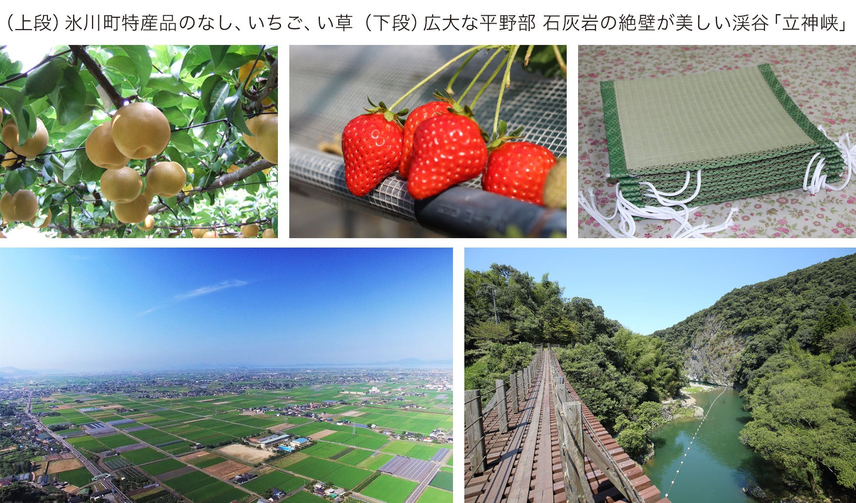 熊本県のほぼ中央に位置する氷川町は、交通アクセスも良く、東部に山林、丘陵地帯、西部には「不知火干拓」をはじめとした平坦地帯が広がる総面積33.3平方kmの町です。町の中央部を流れる「氷川」は町名の由来ともなっており、様々な農作物を作ることができる肥沃な農地を有し、日本有数のい草の産地として知られ、吉野梨(よしのなし)や和鹿島(わかしま)いちご、晩白柚(ばんぺいゆ)をはじめとする柑橘類などの特産品があります。また、熊本を代表する観光地のひとつである、石灰岩の絶壁が美しい渓谷「立神峡(たてがみきょう)」は、キャンプ場としても人気が高く、多くの観光客が訪れています。