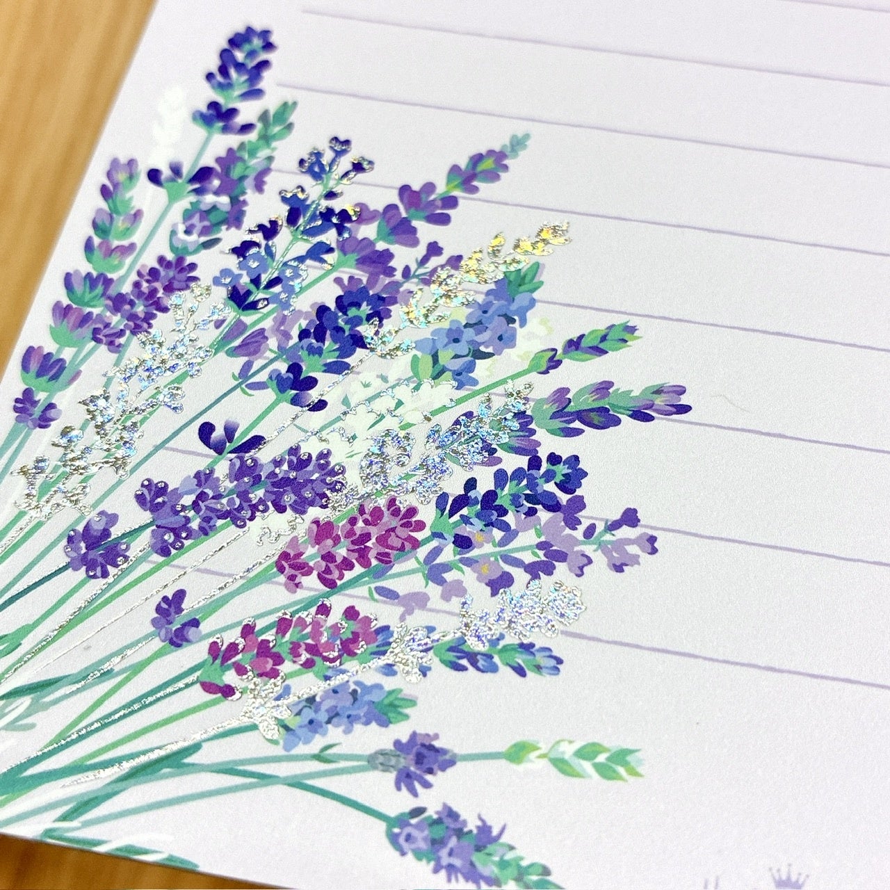 ホログラム箔が華やかにきらめく大胆なラベンダー柄
