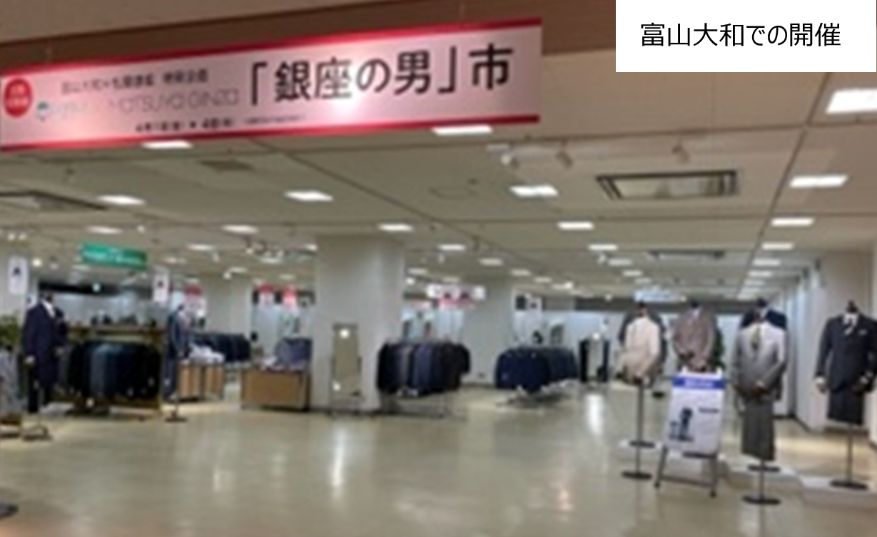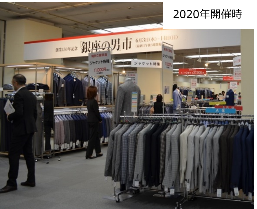 ビジネススタイルのカジュアル化やコロナ禍のリモートワークの普及などにより売り上げは減少傾向ですが、在宅ワークでも動きやすい「アクティブスーツ」を販売したり、密を避けられるゴルフ人気からゴルフバーゲンを併催するなど、コロナ禍のビジネスマンの変化にも対応し、常に進化し続けています。