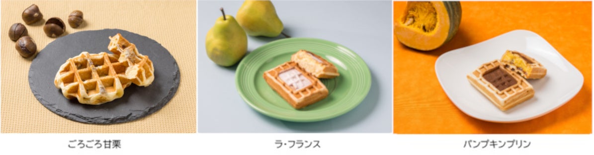 北海道産発酵バターを使った生地に天津甘栗の餡とダイスを包み焼き上げました。香り高い餡と相まって、栗の風味と食感を存分に楽しめるリエージュワッフル『ごろごろ甘栗』、山梨県産ラ・フランスを使用した香り豊かなクリームに、ダイス状の果肉を合わせて包み焼き上げた、甘みと酸味のバランスが絶妙な秋の爽やかなハッシュルワッフル『ラ・フランス』、北海道産えびすかぼちゃを贅沢に使用した濃厚クリームに、ほろ苦いカラメルを合わせ包み焼き上げ、ココアパウダーをかけて大人の味わいに仕上げたハッシュルワッフル『パンプキンプリン』の3種類です。