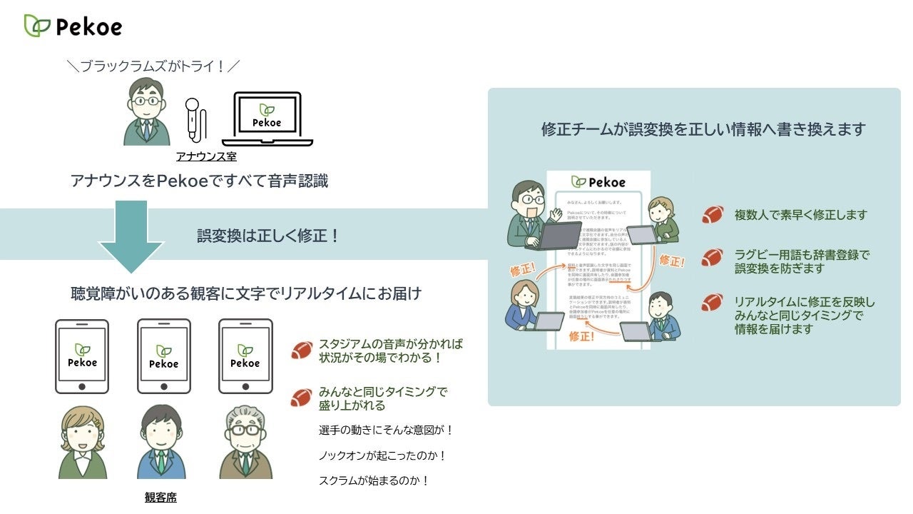 当日は聴覚障がい者の皆さんにもタブレットやスマートフォンで「Pekoe」をご利用いただき、ラグビー観戦を楽しんでいただきます。