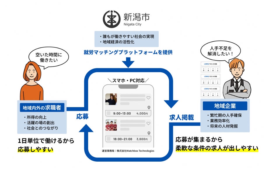 株式会社Matchbox Technologies(マッチボックステクノロジーズ 本社:新潟県新潟市中央区、代表取締役社⻑:佐藤 洋彰)は1回・数時間単位の求人と働き手をオンラインでマッチングする自治体公式のスポットワークプラットフォームの構築・運用をサポートしています。この度、マッチボックステクノロジーズは、新潟県新潟市(市長:中原 八一 なかはら やいち)と「新潟市単日短時間就労マッチングプラットフォーム構築事業」を開始いたします。本事業により新潟市公式のお仕事マッチングプラットフォーム「(仮称)にいがたCITYマッチボックス」(URL:https://matchbox.jp/niigata/niigata-city 8月オープン予定)の開設とアプリケーションの提供を行います。それに先駆けて、7月12日より、「(仮称)にいがたCITYマッチボックス」事業者登録専用サイト(URL:https://matchbox.jp/niigata/niigata-city/dx-project )をオープンします。プラットフォームはマッチボックステクノロジーズが管理保守・運用を行い、企業・事業所はマッチボックステクノロジーズに利用申し込みを行います。