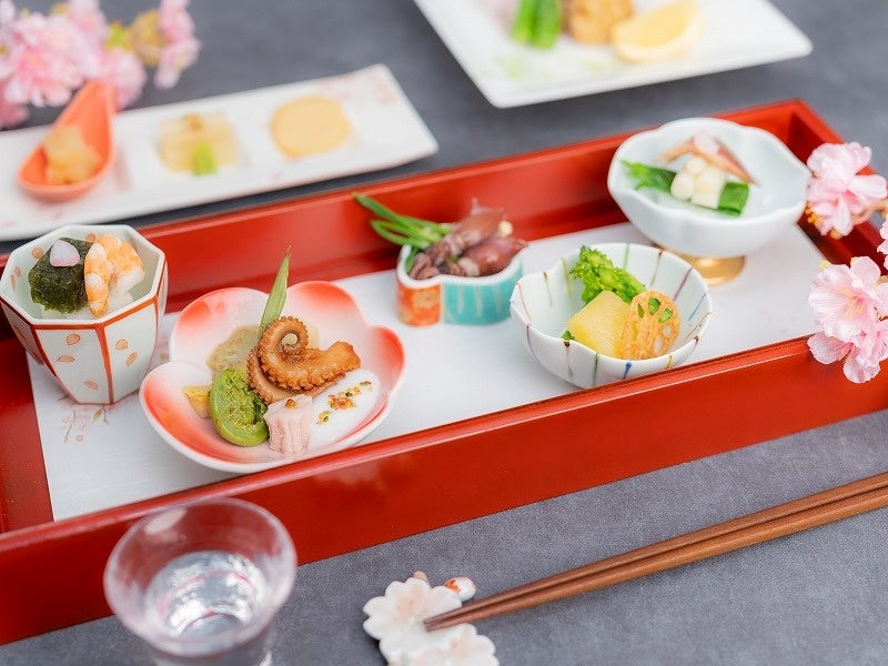前菜はうるいやこごみなどの山菜や、旬のホタルイカや蛸などの海の幸をふんだんに使用した春らしい彩りの小鉢盛りをご用意。中でも使用される「小笹うるい」は、農林水産省の地理的表示(GI)保護制度に登録され、上山市の伝統野菜として知られています。うるい特有のぬめりが強く、シャキシャキとした食感を有し、食用として好まれる茎の白い部分が一般的なうるいに比べて2割程度長いのが特徴です。一般的なうるいに比べて高価で希少なうるいをお召し上がりいただけます。
