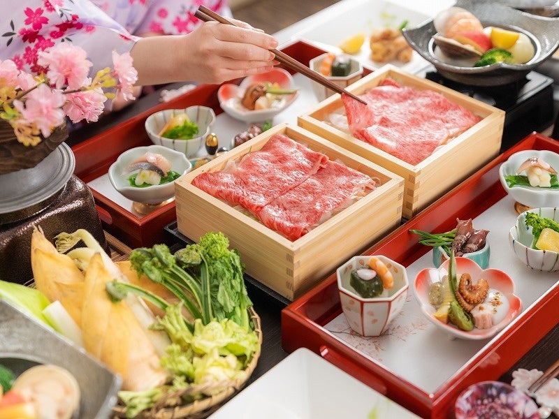 地元が誇る銘柄牛「山形牛」は、肉のきめが細かく適度な霜降りで、舌にのせたときの柔らかさとまろやかさが特徴です。山形の豊かな自然と厳しい気候条件が生み出す山形牛は、まさに山形風土の味そのもの。そんな山形牛を温泉蒸ししゃぶでご用意。春会席では、山形県産の山菜と一緒にお召し上がりいただけます。