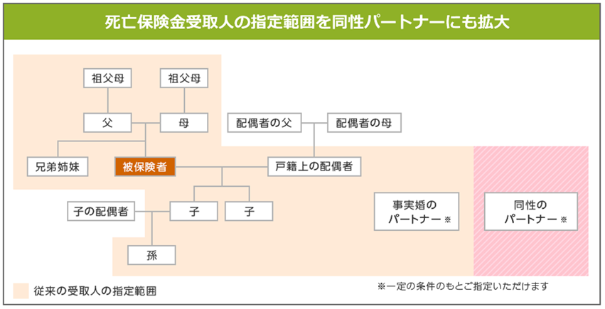 当社は、2015年11月から、死亡保険金の受取人の指定範囲を拡大しており、「同性のパートナー」を受取人に指定することを可能としています。本取組み開始後、当事者やご契約者さまから「サービスを開始したと知って感動した」、「受取人を同性パートナーに変えたい」、「当事者ではないが、ライフネット生命に加入していることを嬉しく思う」という賛同の声を多数いただきました。