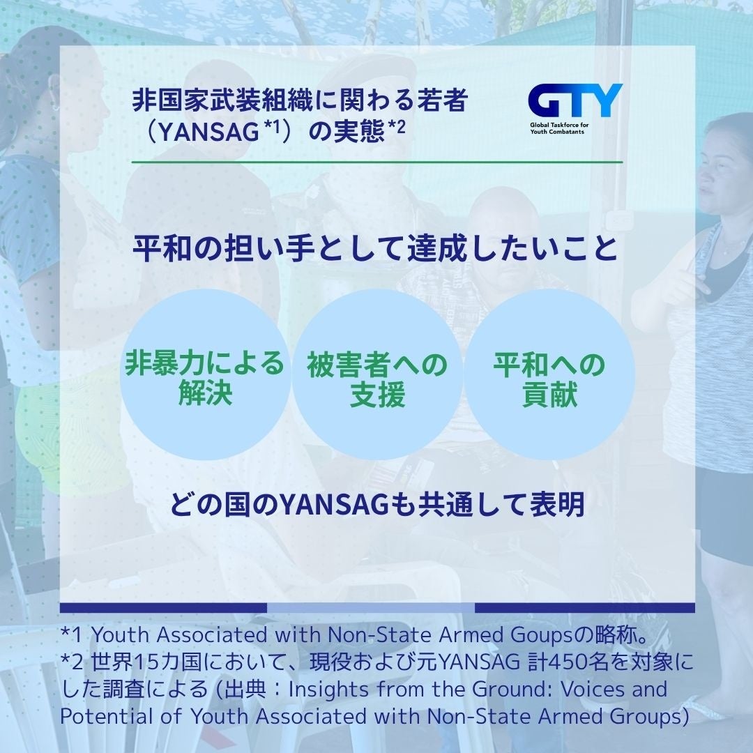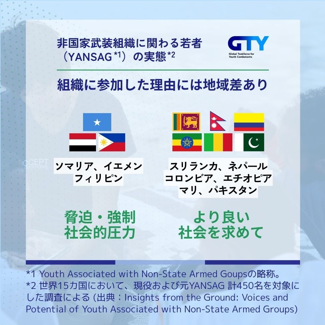 YANSAG(Youth Associated with Non-State Armed Groups)とは、いわゆるテロ組織を含む非国家武装組織に関わっている/関わった18〜35歳の若者のことを指します。