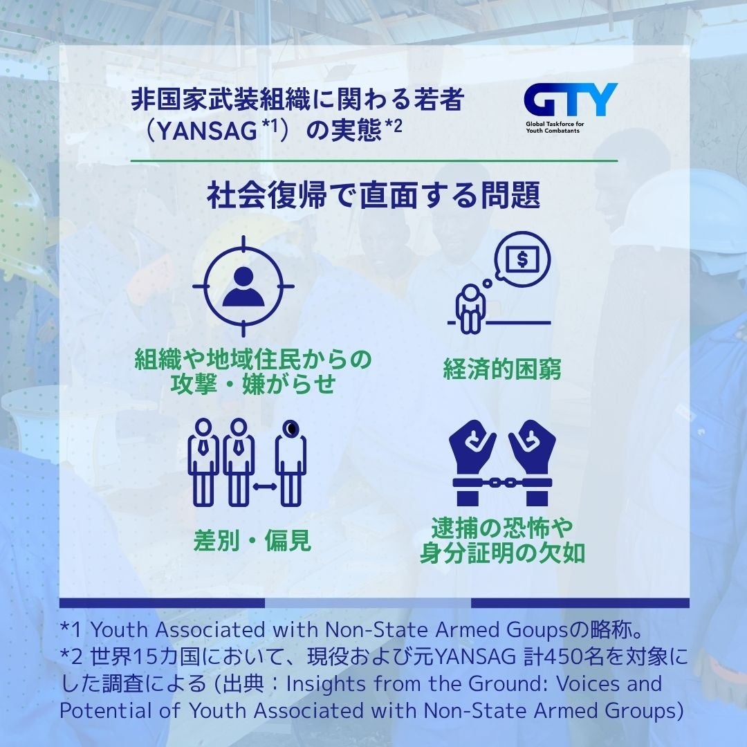 社会復帰においてYANSAGが直面する課題としては、武装組織からの攻撃、また武力紛争の終結から10年以上が経過しても、多くのYANSAGが厳しい経済状況や、差別やスティグマ(社会的なレッテル)、そして法的地位の不安定さに直面していることが明らかになりました。