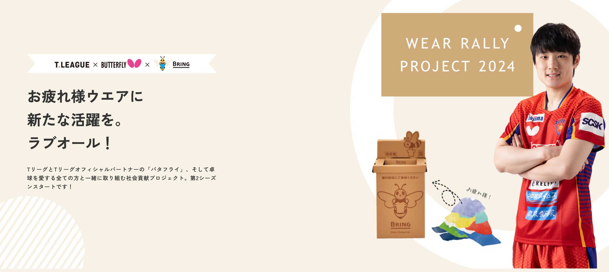 バタフライは、Tリーグと共同し、ウエアリサイクル活動「WEAR RALLY PROJECT 2024」を実施することが決定しましたのでお知らせいたします。