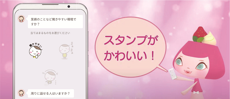 『SKD』は、派遣スタッフに就業状況を尋ねるメッセージを定期的に送信し、そのメッセージに「かわいいスタンプ」を使って返信するだけで営業担当者に自身の状況を簡単に伝えられる機能です。