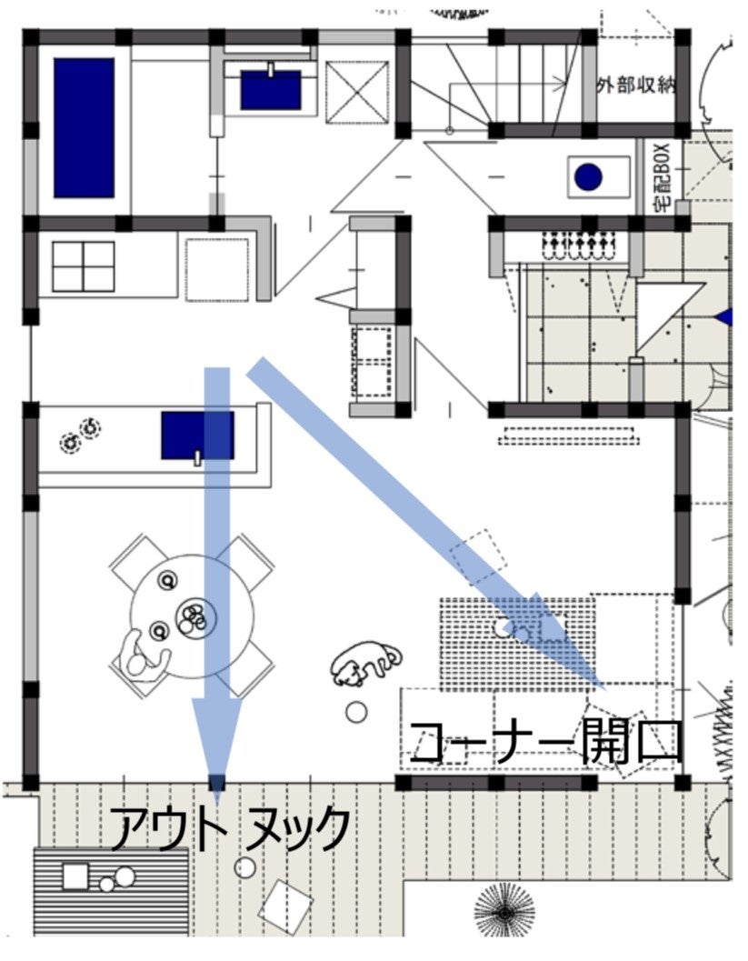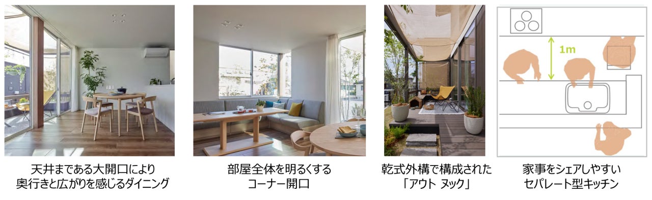 リビング・ダイニングは、天井高さの大開口を設けることで、外の景色を室内に取り入れ、奥行きと広がりを感じる空間に。大開口により、屋内と一体化された屋外空間は、自然の光や風を感じられる「アウト ヌック」として、家族にあったライフスタイルを満喫できます。また、2方向に広がるコーナー開口は、室内に光を取り入れ、外観のアクセントとしてデザイン性を向上します。 キッチンはリビング・ダイニングを見渡せる場所に配置。食事の時間をより効率的に楽しめるように、シンクとコンロをセパレートし、シンクと作業台を一体化した「セパレート型キッチン」を採用しました。家事をシェアしやすい環境をつくり、家族間のコミュニケーションの醸成を図っています。