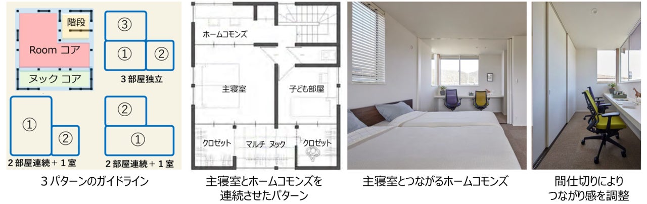 「2部屋連続+1室」では、主寝室と連続する位置に、家族のコミュニケーションを育む知的空間「ホームコモンズ」を配置し、残り1室を子ども部屋とするプランを用意。天井高さまである建具で間仕切りし、家族間のつながりを調整しながら、学びや趣味、仕事を通して、親子が互いに刺激し学び合う空間を提案します。