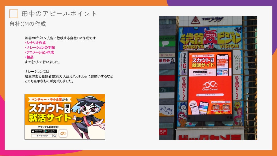 新卒1年目だった昨年同様会社のクリエイティブを1人で背負うに留まらず、今年は渋谷ビジョン動画広告の制作から自治体の漫画制作まで大きな仕事を自分で回し、大学ではキャリア講師として登壇するなど、その活躍の広さが高く評価された。