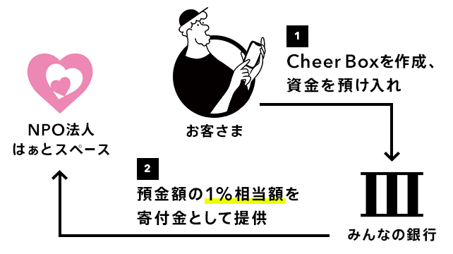 これにより 、Boxの預金残高に応じて、みんなの銀行が、本大会で車いす競技の支援を行っているNPO法人はぁとスペースにパラスポーツ支援のための寄付金を送ります。