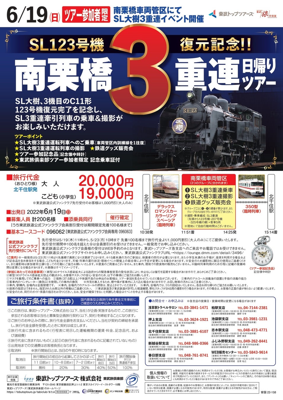 東武トップツアーズ株式会社(本社:東京都墨田区、社長:百木田康二)は、C11形123号機の復元完了を記念して6月19日(日)に行われる「SL大樹3重連イベント」において、同機を含むC11形蒸気機関車3両が牽引する客車列車(SL3重連牽引列車)への乗車および撮影に参加できる日帰りツアーを販売することとなりましたので、お知らせします。
