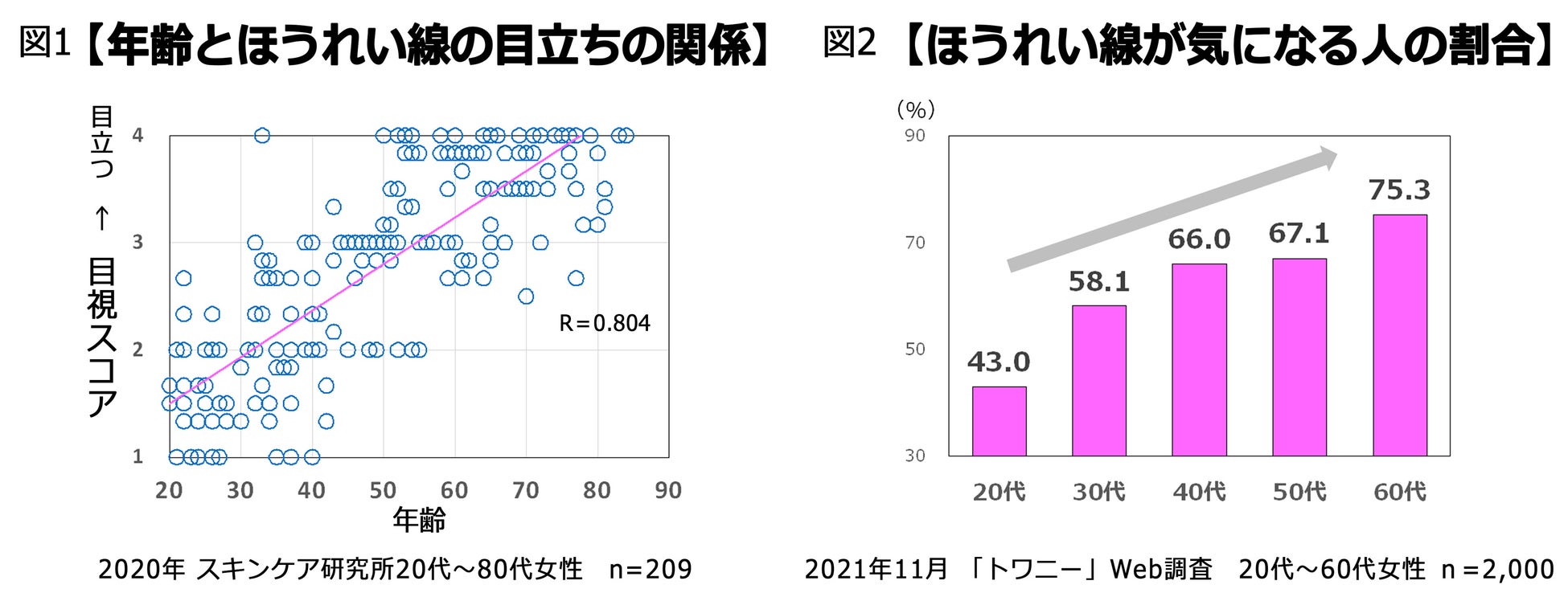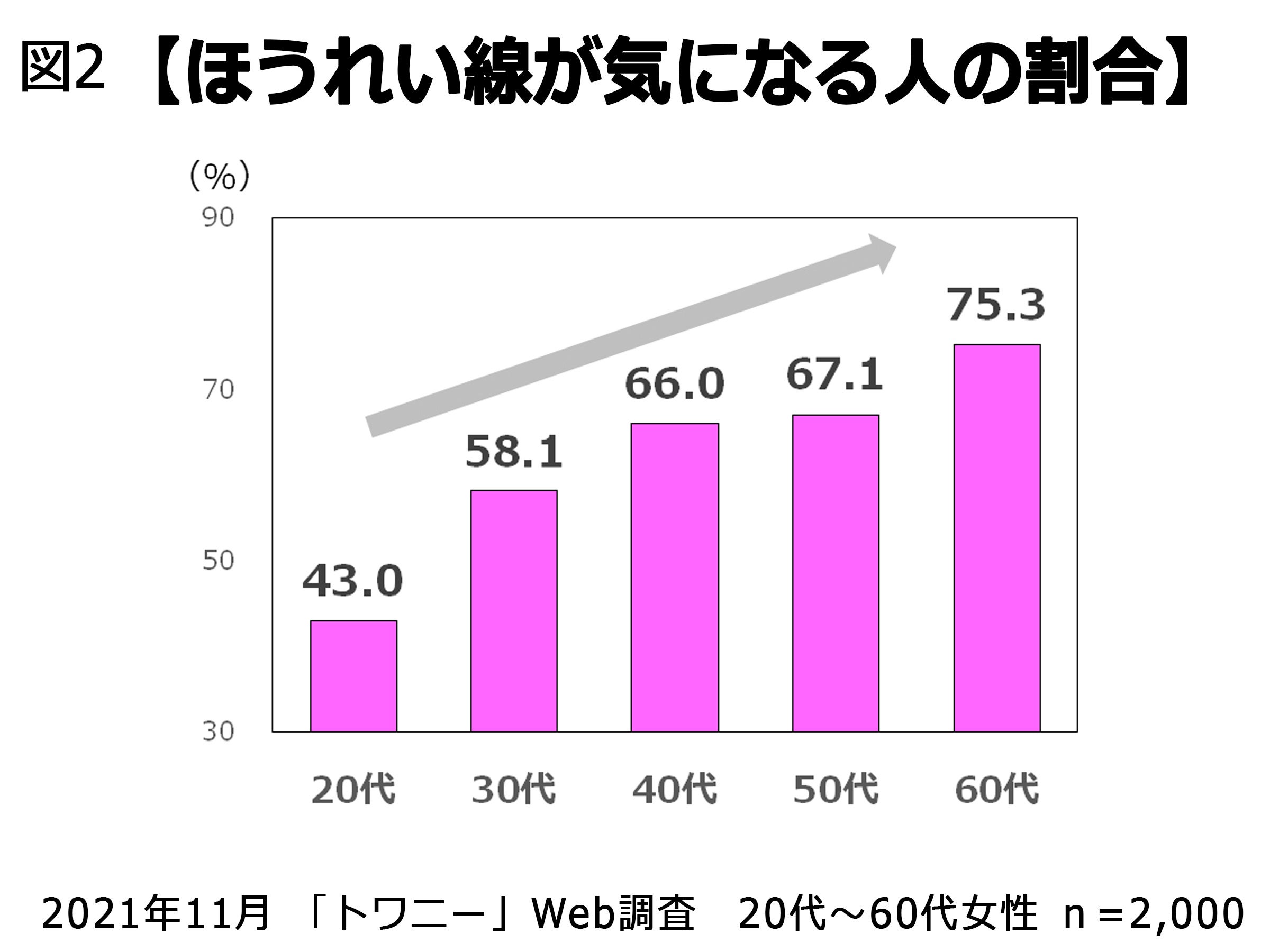 ほうれい線は、しわやたるみなどと同様に、加齢に伴い目立つようになります(図1:花王スキンケア研究所調べ)。実際、花王グループのカネボウ化粧品が販売するカウンセリングブランド「トワニー」の意識調査からも、年代が上がるにつれてほうれい線を気にする人が増えていることがわかります(図2)。また、マスク生活によりほうれい線が隠れた状態を見慣れたことで、マスクを外したときにこれまで以上に自分のほうれい線の目立ちが気になる、という声もよく聞かれます。そこで花王BRCCは、見た目年齢とほうれい線の関係に着目した調査を行いました。