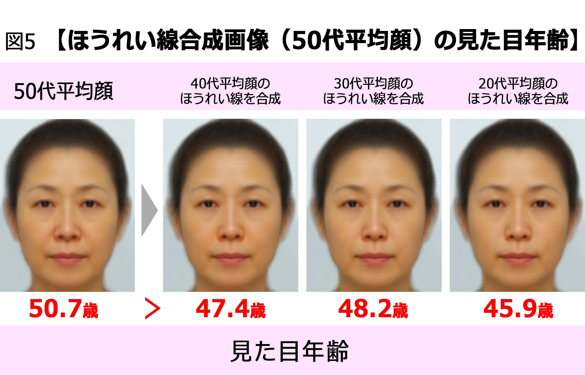 すると、目もとや肌のハリ感などが若々しい20代の平均顔に、上の年代のほうれい線を合成するだけで老けて見えることが判明(図4)。また、目もとや口もと、フェイスラインなどにたるみが見られる50代の平均顔に、下の年代のほうれい線を合成するだけで、見た目年齢が若く評価されました(図5)。これにより、ほうれい線の長さや濃さなどの状態が見た目年齢に影響を与えることが確認できました。
