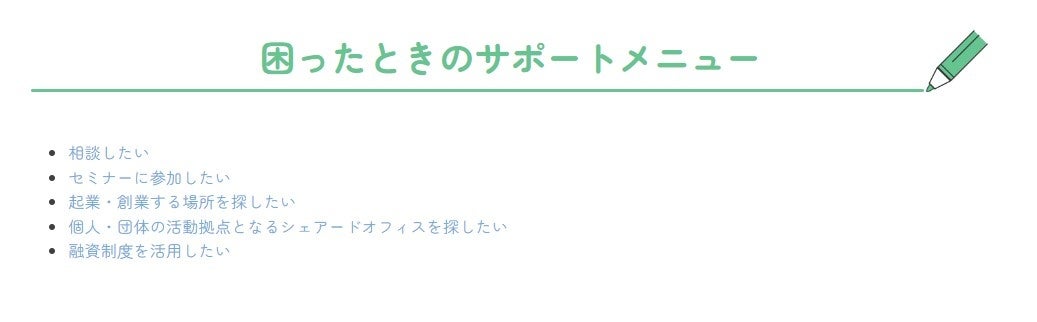 令和4年6月からは、「困ったときのサポートメニュー」を項目ごとに整理して利便性を向上させたほか、起業・創業に必要な手続きを紹介しているコンテンツの一部を改善するなど、サイトをリニューアルしました。
