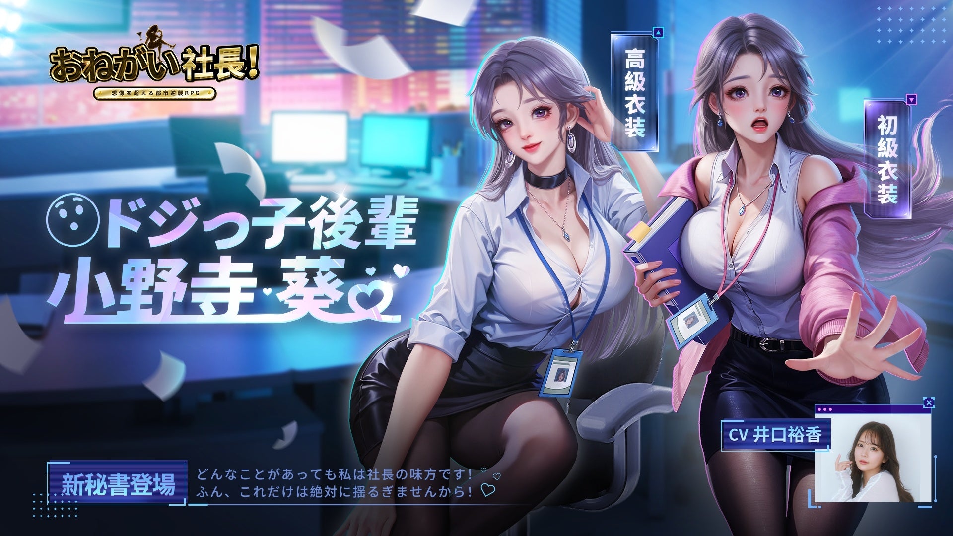 会社経営シミュレーションゲーム「おねがい社長!」に新規秘書、ドジっ子後輩 「小野寺葵(CV:井口裕香)」が2025年6月4日(水)から登場します。CV公開記念の抽選イベントも開催されますので、ぜひお見逃しなく!