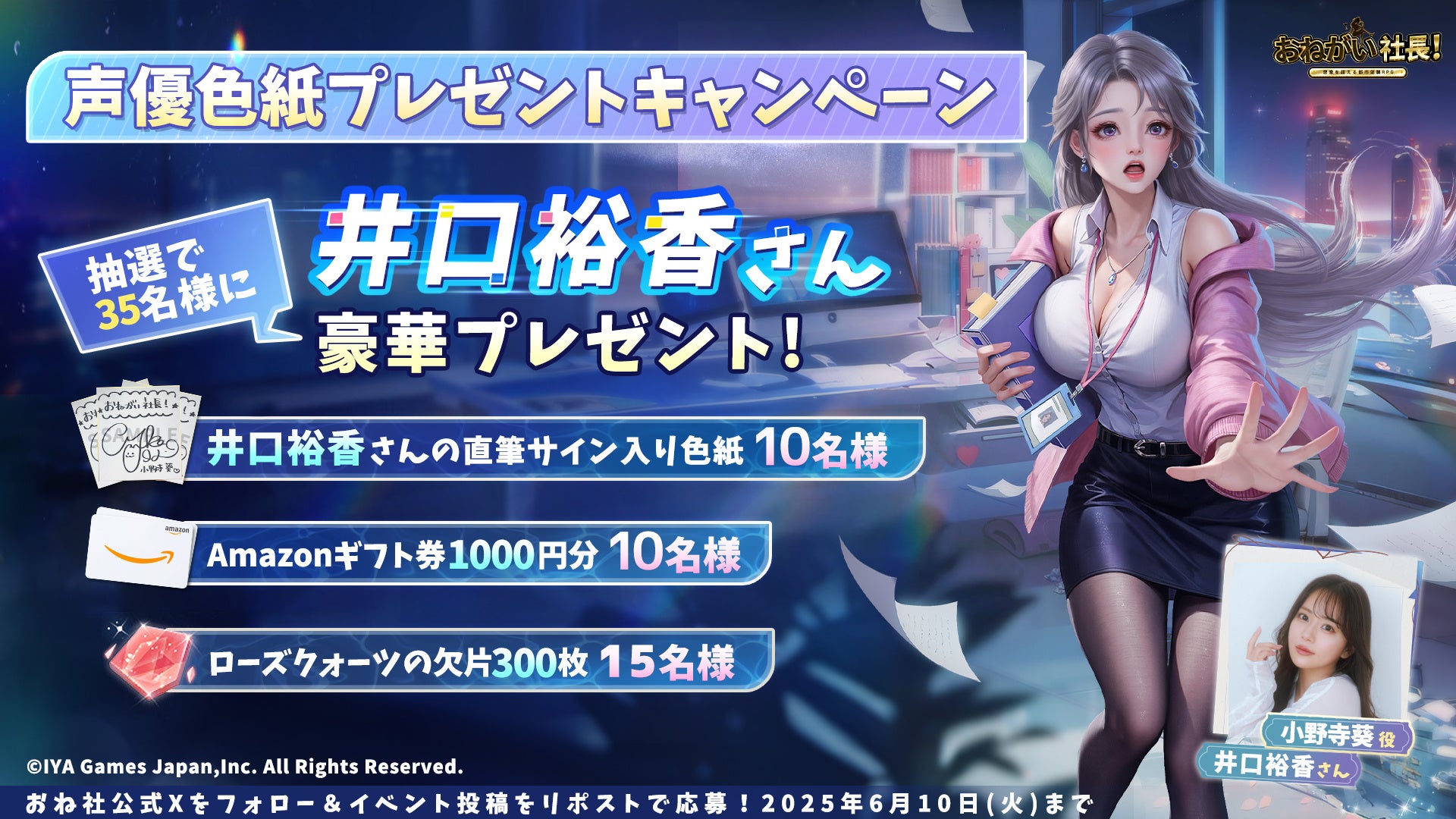 抽選賞品:井口裕香さん直筆サイン入り色紙×10名様、Amazonギフト券1000円分×10名様、ゲーム内アイテム「ローズクォーツの欠片300枚」×15名様
