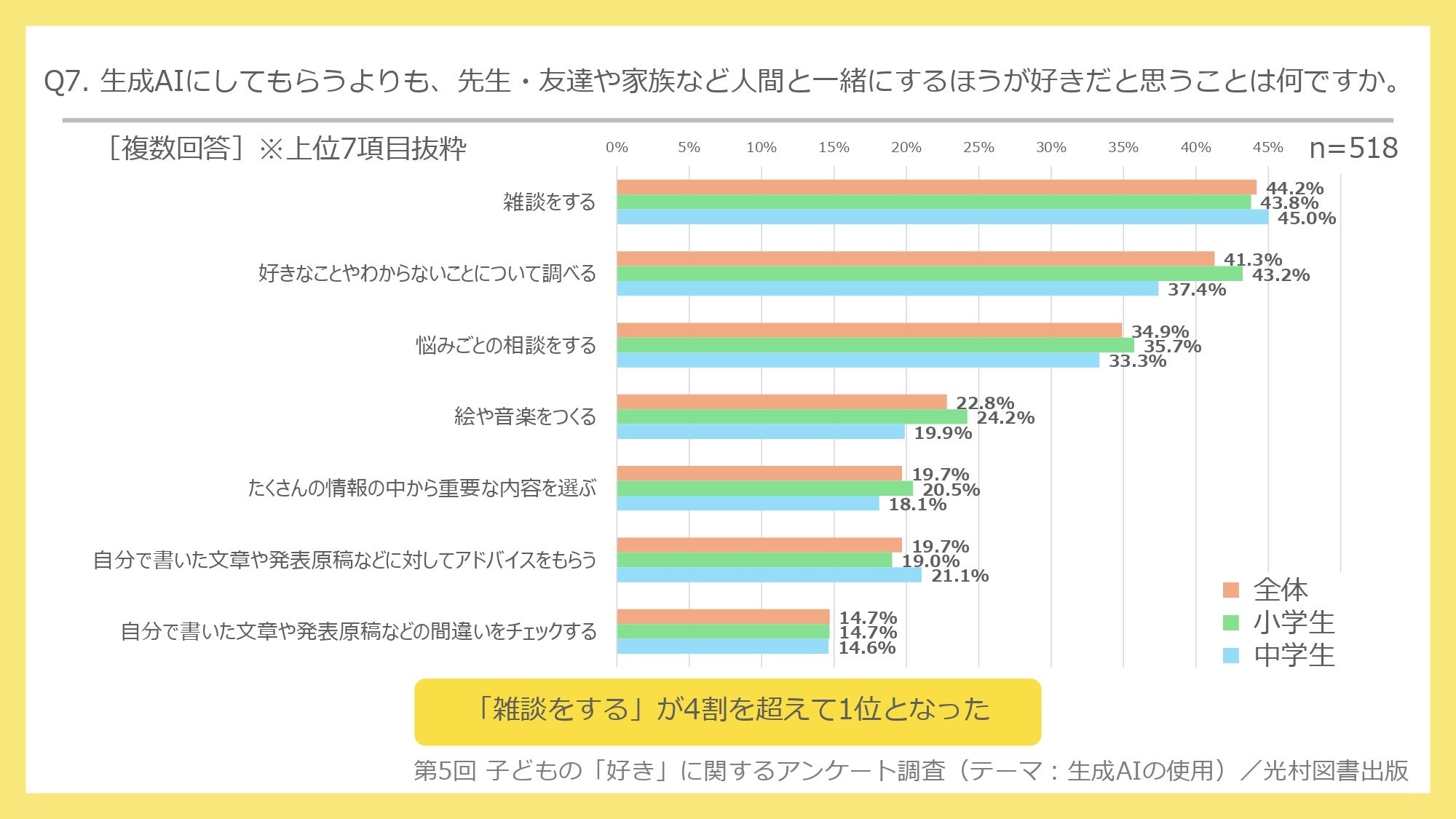 Q7. お子さまが、生成AIにしてもらうよりも、先生・友達や家族など人間と一緒にするほうが好きだと思うことをすべて選んでください。(複数回答) ※上位7項目抜粋