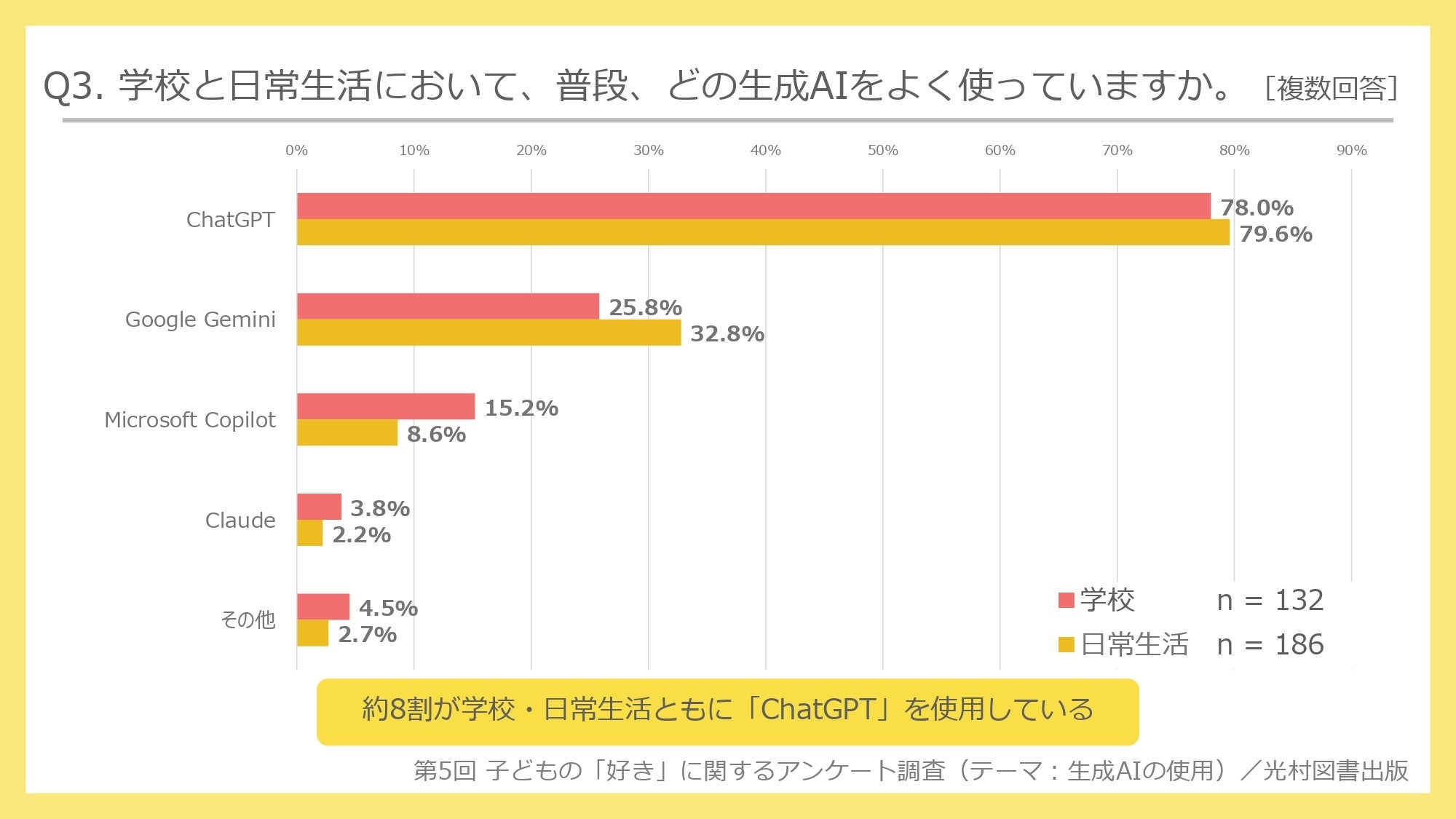 全体では、「学校」、「日常生活」ともに、「ChatGPT」が最も多く、約8割に達した。2位の「Google Gemini」は約3割にとどまった。