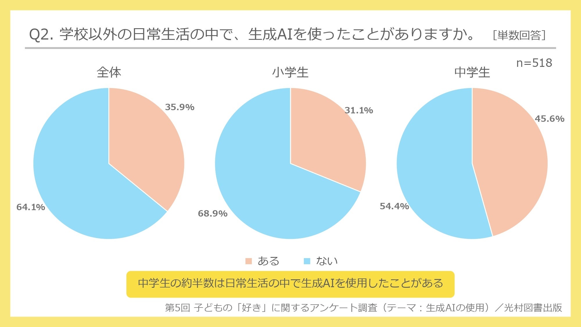 全体では、「ある」が35.9%、「ない」が64.1%となった。Q1(学校の授業の中での使用状況)と比べると、日常生活の「ある」の回答のほうが、10.4pt高い結果となった(学校の授業の中25.5%、日常生活35.9%)。