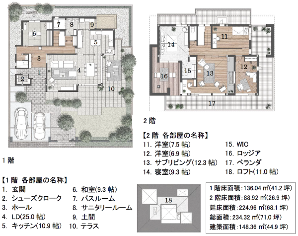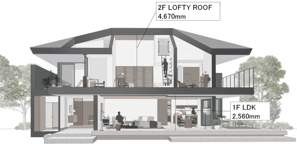 Ⅱ.1階階高アップ・2階ロフティルーフが生み出す伸びやかで落ち着きのある大空間