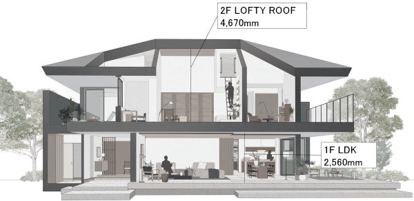 柱や間仕切りのない空間は、重鉄構造だからつくれる、豊かな開放感で縦横への伸びやかな広がりを実現します。1階は、邸宅のおおらかな広がりに見合う高天井に大開口を掛け合わせ、2階には、大屋根のある住まいならではの勾配天井が生み出す縦へのさらなる伸びやかさがあります。天井高最大5,100mm、最大12.5帖の圧倒的な大空間をつくり出す「LOFTY ROOF(ロフティルーフ)」は、高さのある勾配天井が開放感と深い落ち着きを演出。ロフト空間を活用することで、暮らしの楽しみ方も広げます。