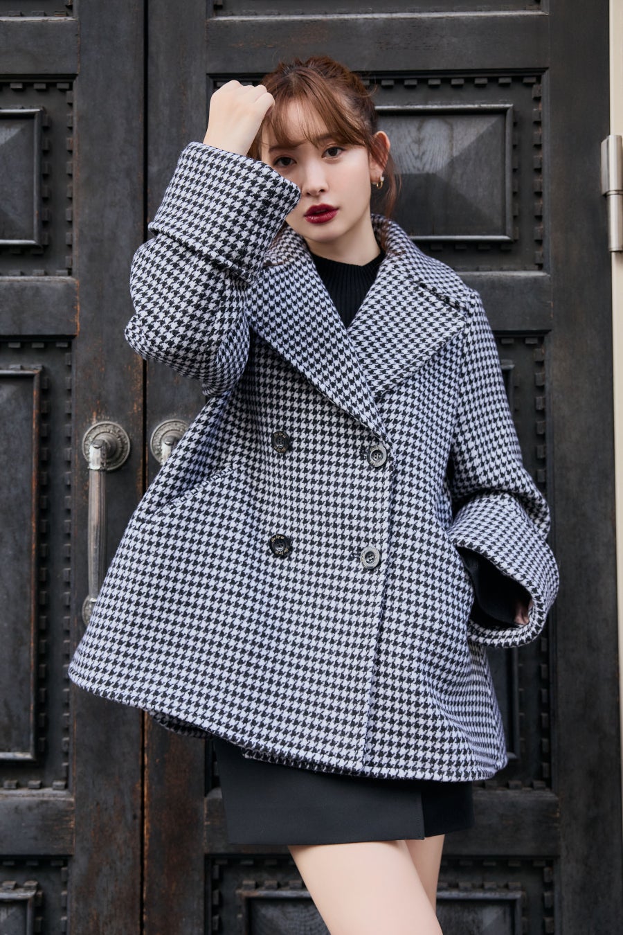 キービジュアルとなるシックな千鳥柄が目を惹くウールブレンドコートはシルエットが美しく、リュクスな存在感を放つ一着。